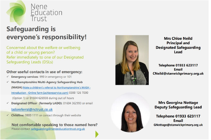 If you have any safeguarding concerns in relation to the Headteacher please contact the CEO of Nene Education Trust – 01933 627081